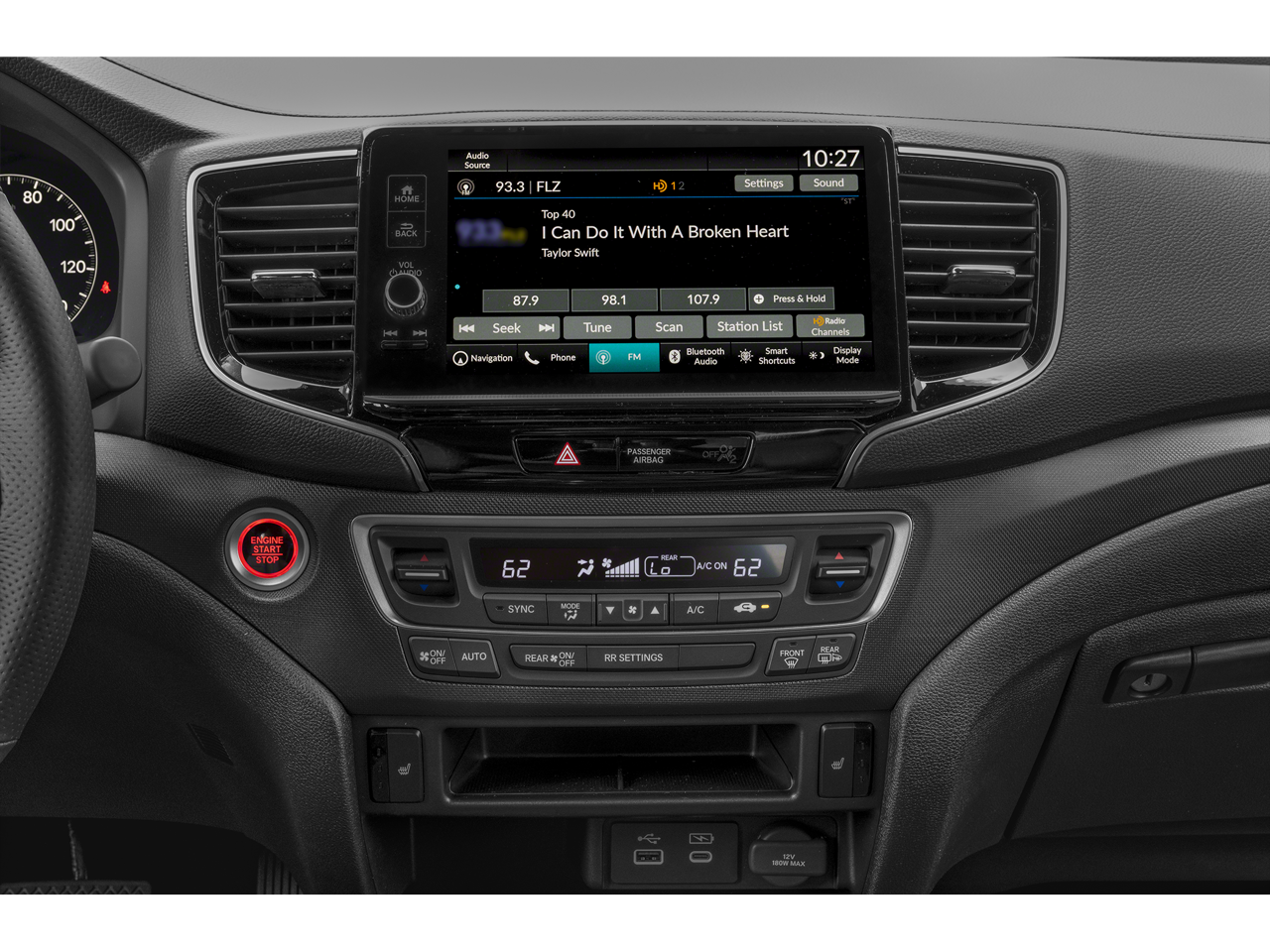 - Radio: 215-Watt Audio System w/7 Speakers -inc: subwoofer, 9" color touchscreen, Bluetooth® streaming audio, Speed-Sensitive Volume Compensation (SVC), wireless Apple CarPlay/Android Auto compatibility, HD Radio, 2.5A USB-A data port in front console and HondaLink